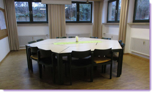 Das Gemeindehaus befindet sich in der Weiherstr. 10 im Stadtteil Weiherhof, nur ca. 50m vom Wald entfernt. Im Erdgeschoß befinden sich der große Saal, eine offene Küche sowie ein Foyer. Im Untergeschoss gibt es zwei Gruppen- und Seminarräume und eine offene Küchenzeile. Im Dachgeschoss ist ein Spielzimmer für kleinere Kinder eingerichtet. Vor allem der dazugehörende große Garten macht den Ort für Familien mit Kindern sehr attraktiv.